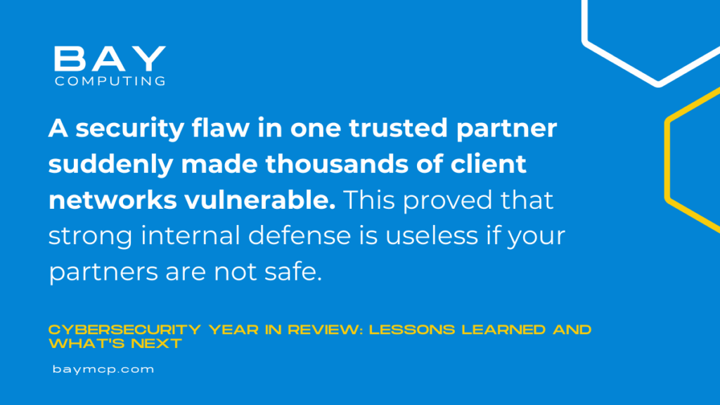 Ransomware stayed in the news, but the attacks became more focused. They often skipped direct entry and attacked weak spots in the supply chain. A security flaw in one trusted partner suddenly made thousands of client networks vulnerable. This proved that strong internal defense is useless if your partners are not safe. (See the detailed analysis by the CISA Annual Threat Report for more context).